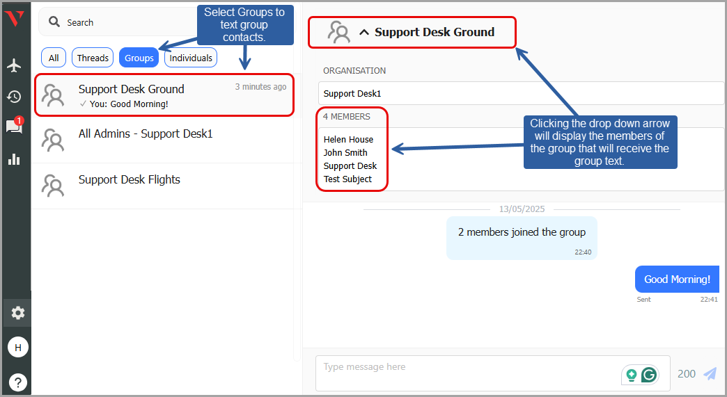 When an Active(A) Group(B) has the Spidertxt(C) option enabled(D), both the Group will appear in the Spidertxt contacts list and show that this group is an available messaging contact.