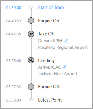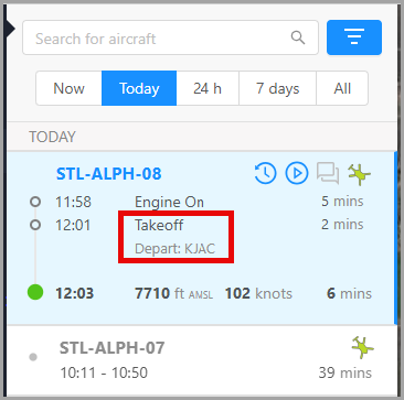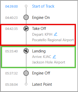 When an aircraft is selected in the Aircraft list, the expanded panel includes a mini timeline of key flight events. If takeoff and landing events have occurred, and locations for these have been identified, they will be shown: