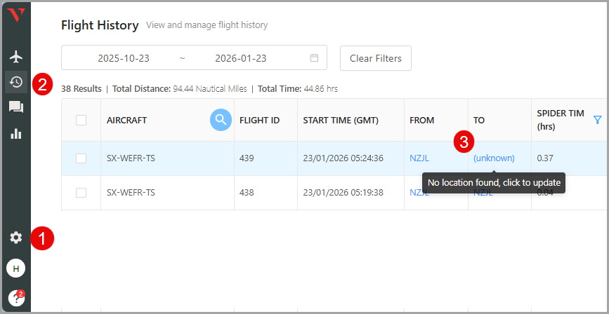 When a takeoff or landing event is recorded, Fleet Manager cross-references the event against an extensive list of known locations suitable for aircraft operations, along with any Custom Locations configured within your organisation.