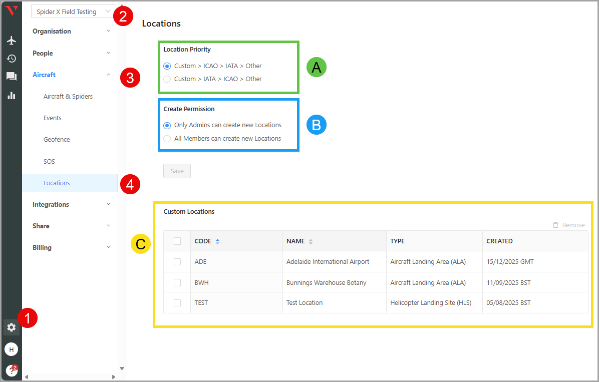 All custom Locations created within your Organisation will be listed in the Custom Locations table to: