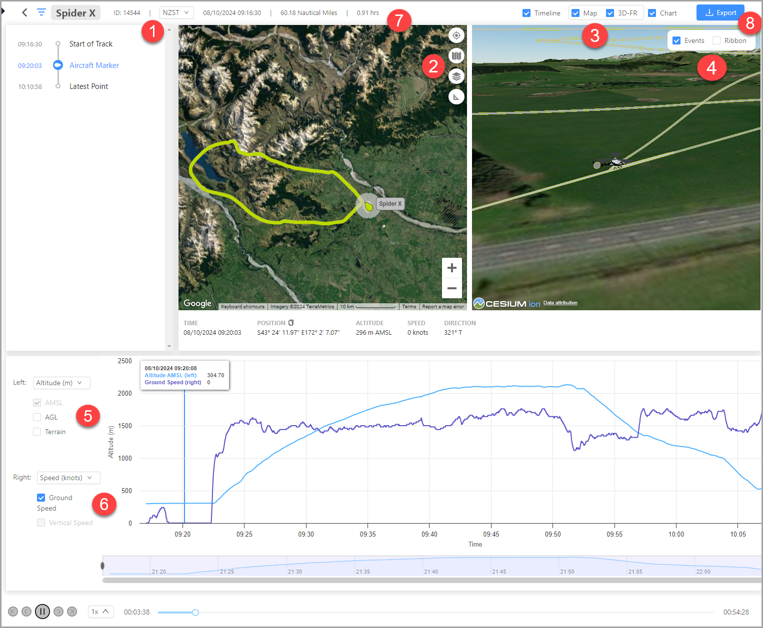 | 2 | You can drag the altitude and speed bar to any specific point in the track to view the track events, and 3D replay that took place. |