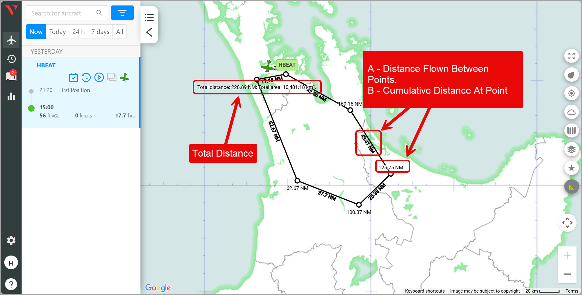 The distance measurement tool can be useful for things such as understanding individual legs or the total length of a flight for quoting and billing purposes.