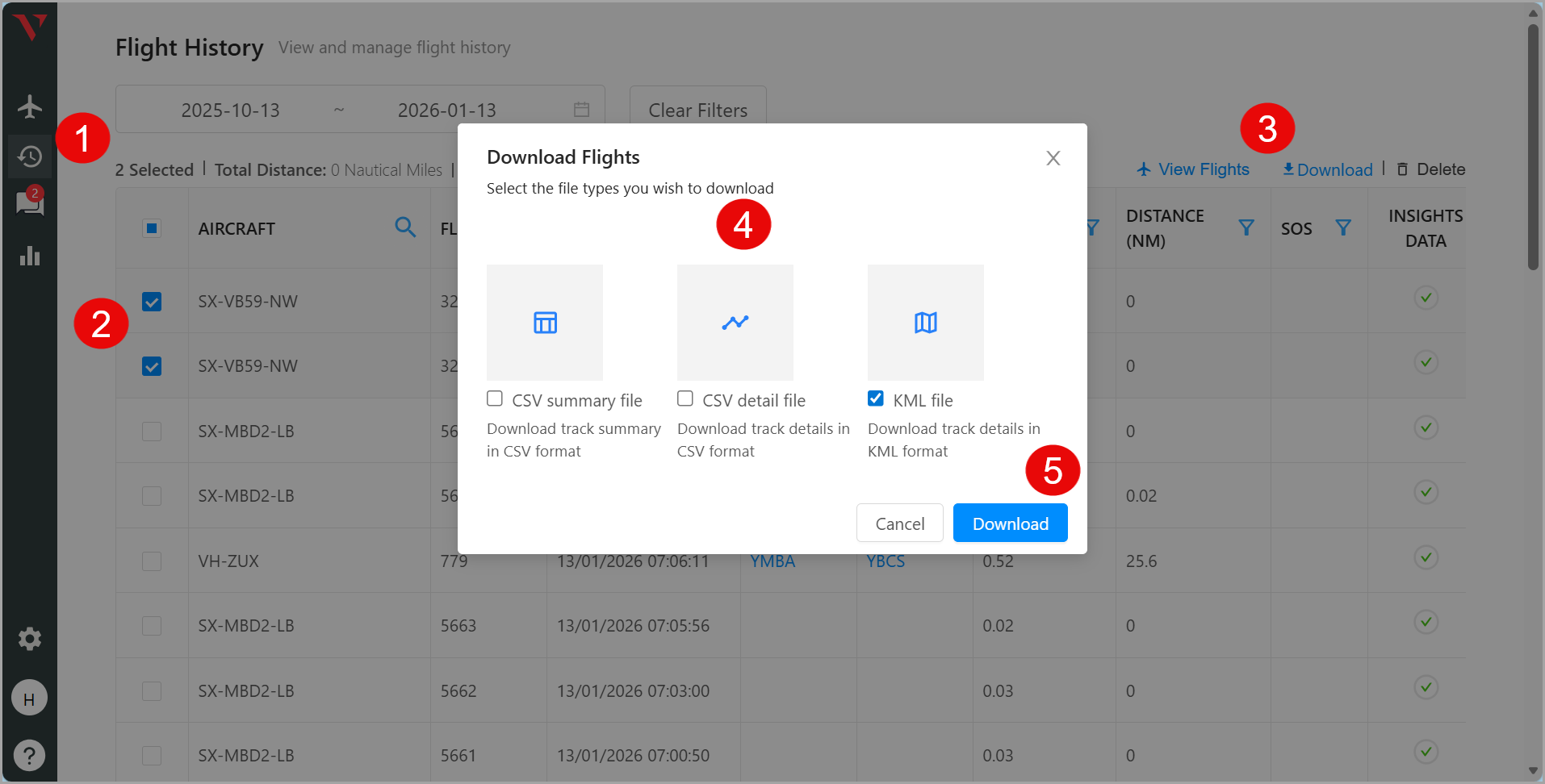 Or a summary file which will supply Aircraft, Flight ID, Start Time in Local time and UTC, duration of flight, distance and any events / notifications.