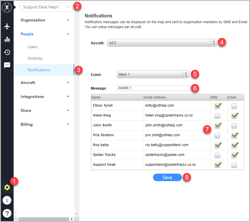 Notifications are canned messages that can be sent from the Spider to the website, via SMS or by email to your members.